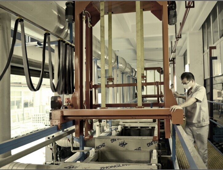 第一條生產(chǎn)線是2012年建成的,主要是對金工和腰輪的殼體、葉輪、機芯、轉(zhuǎn)子、端板、端蓋等關(guān)鍵零件進行陽極氧化處理。對不同材料的殼體及零部件進行陽極氧化處理時,其電解液溫度、電壓和工序是不同的,工藝要求也不一樣,需要進行分批處理。如:金工車間殼體進行硬質(zhì)陽極氧化時,溶液內(nèi)溫度要調(diào)至6~9度;而腰輪車間G10~G400-4〞 殼體進行硬質(zhì)陽極氧化時,溶液內(nèi)溫度是0度;另外,在進行硬質(zhì)陽極氧化之前還要放入酸洗槽,進行化學拋光處理。這樣,不僅操作工序繁雜,而且時間上也比較漫長,效率不是很高。因此,現(xiàn)增設(shè)了第二條陽極氧化生產(chǎn)線,運行后,可以兩邊同時進行陽極氧化處理,工作效率得到了明顯的提高。