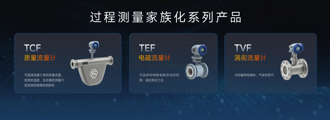 過程測量新產(chǎn)品:TCF質(zhì)量流量計、TEF電磁流量計、TVF渦街流量計。以“多場景適配、高精度覆蓋”為核心優(yōu)勢,形成從常規(guī)壓力到超高壓、從氣體到液體的全產(chǎn)業(yè)鏈計量矩陣。